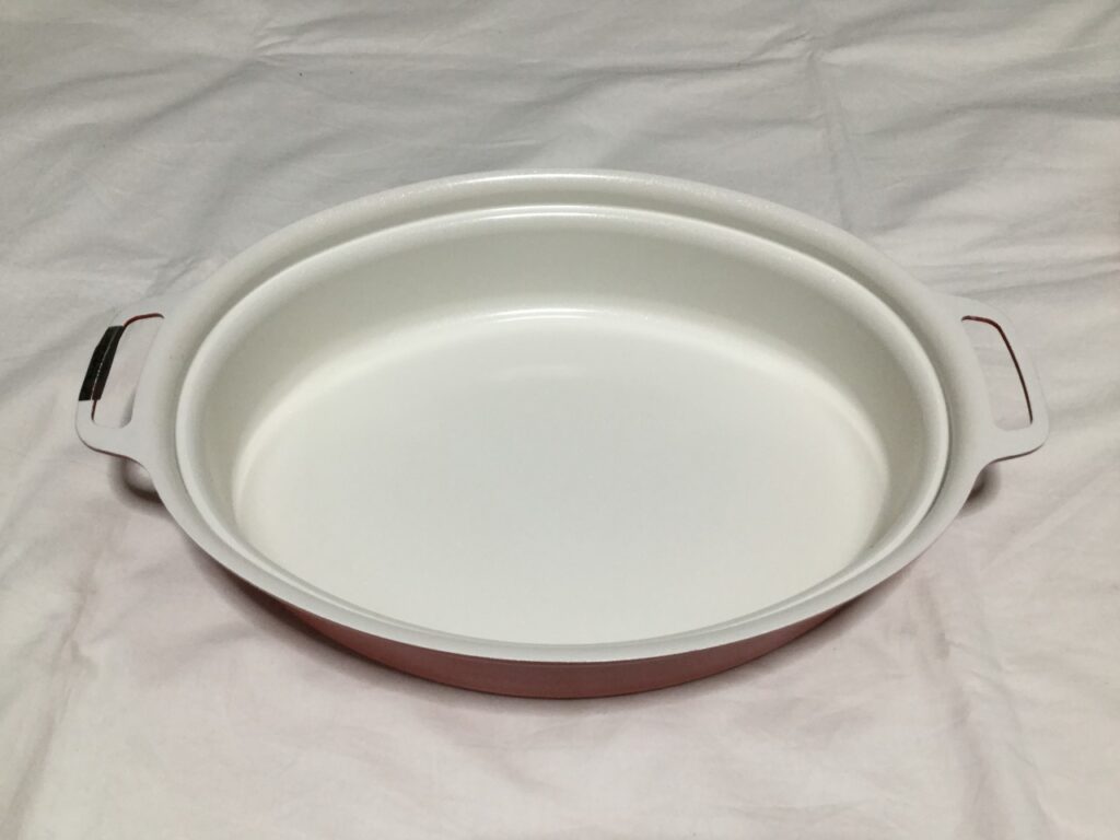 鍋-左側の取っ手の黒いものは注意書のシールで、はがせます。表面はつるつるとしていて洗いやすそうです
