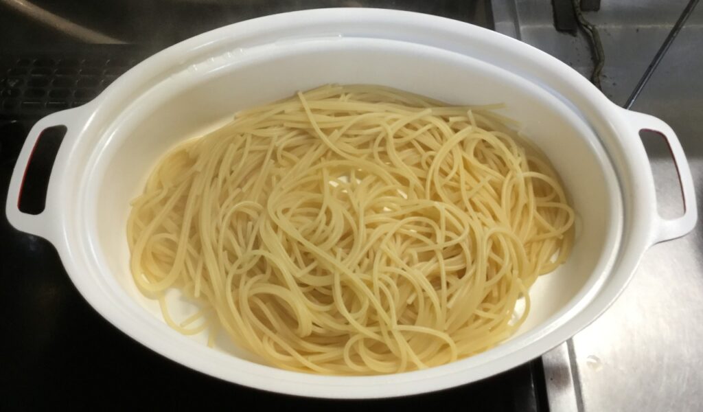 作り方は、水1リットルを沸騰させ、小さじ1杯の塩を入れて、パスタ150gを8分茹でました。